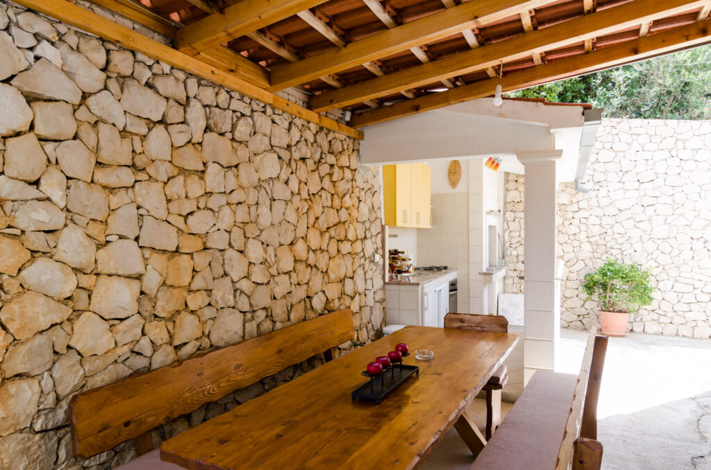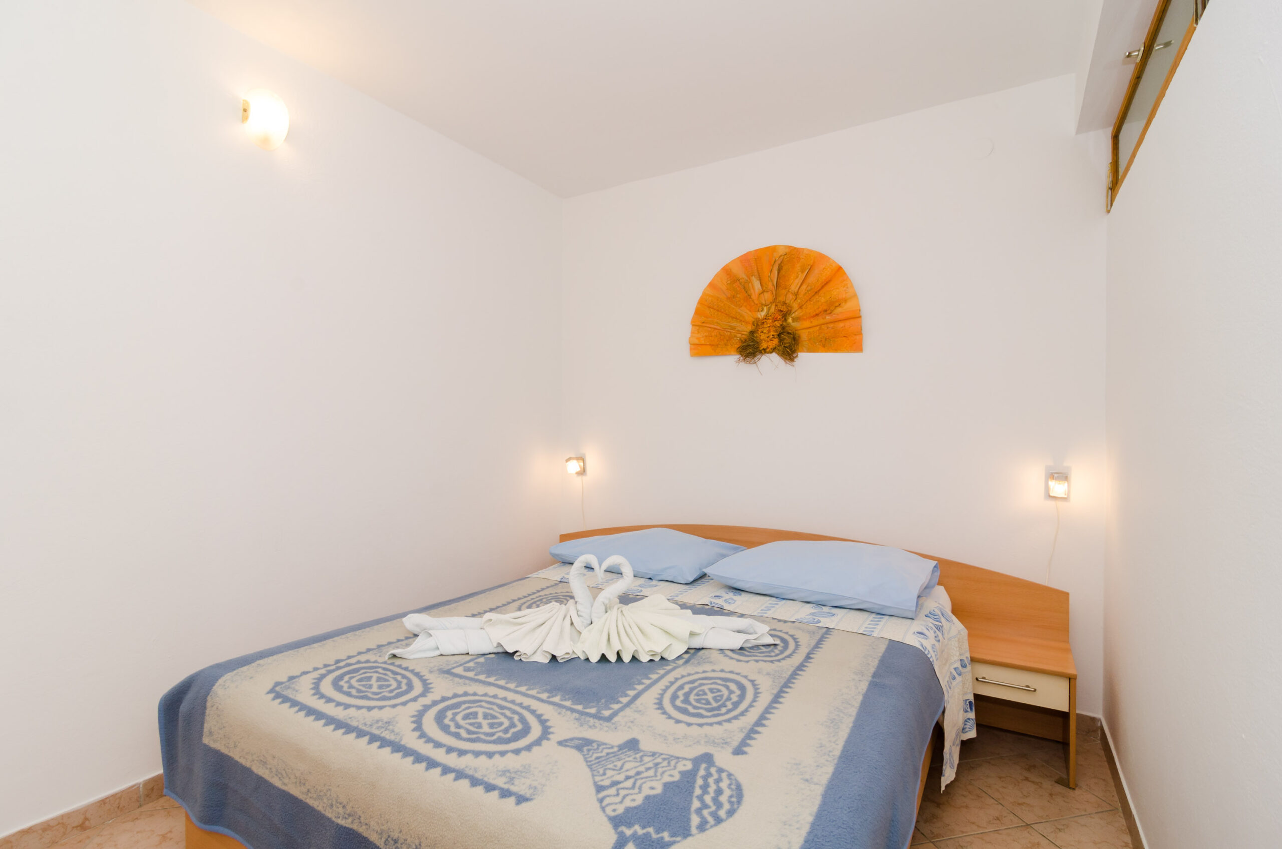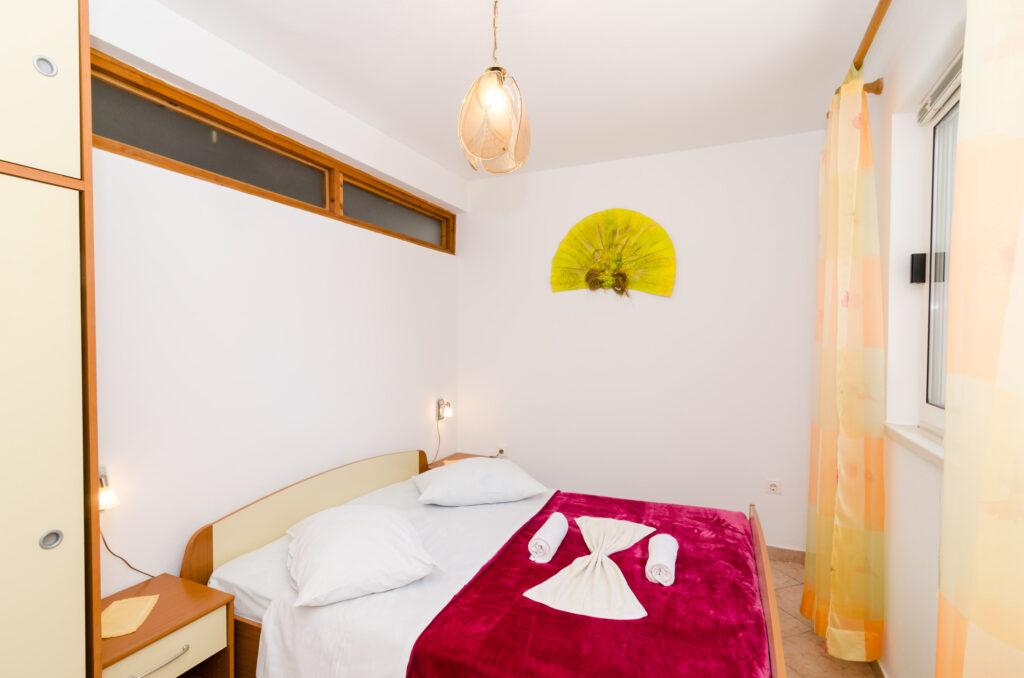 Duże apartamenty nr 5 i nr 6 znajdują się na drugim piętrze domu. Każdy apartament ma dwie sypialnie (łóżka podwójne), w pełni wyposażoną kuchnię z jadalnią, sofę, klimatyzację, łazienkę, TV Sat i balkon z widokiem na morze.