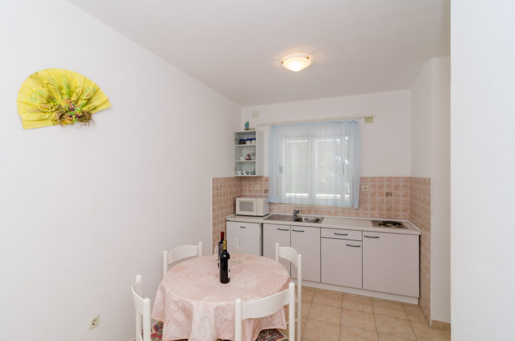 Apartament nr 1. znajduje się na parterze. Posiada dwa pokoje z podwójnymi łóżkami. Jest w pełni wyposażona kuchnia z jadalnią, sofa, TV Sat, klimatyzacja, łazienka i taras, który znajduje się obok domu. Parking znajduje się przed wejściem do apartamentu. Ten apartament jest łatwo dostępny dla osób poruszających się na wózkach inwalidzkich.